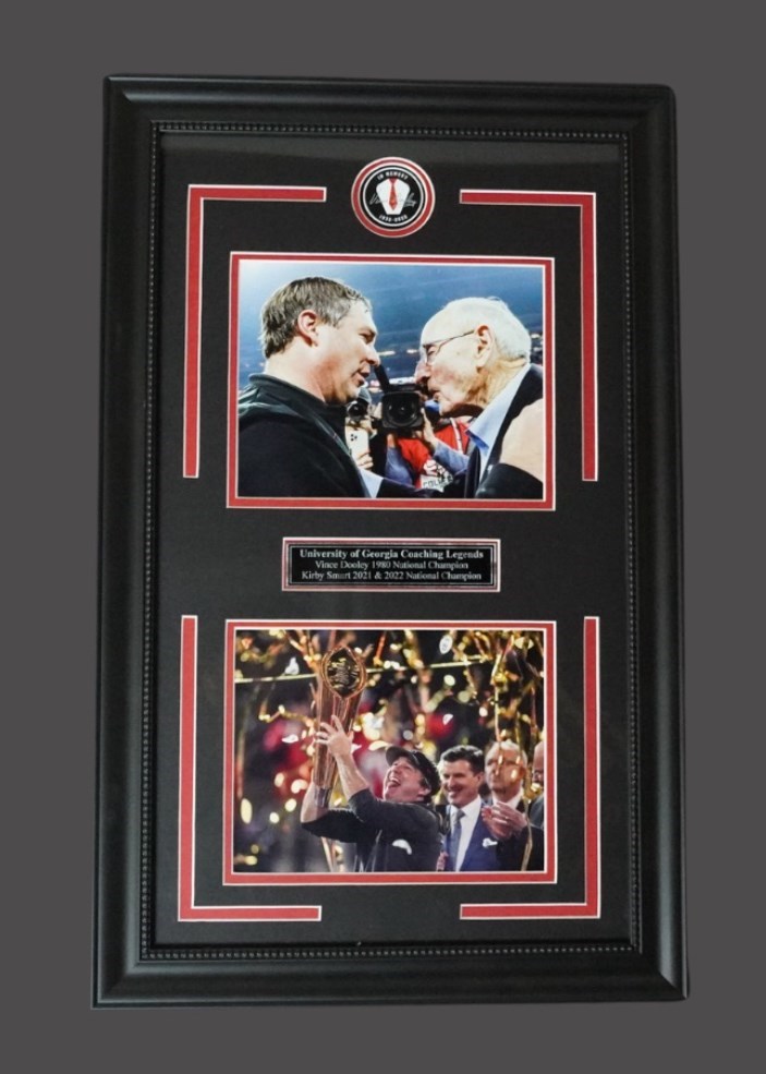 Framed Photo Set – Vince Dooley & Kirby Smart + National Championship Moment – Auction Item Celebrate the past and present of Georgia football with this framed two-photo tribute featuring coaching legends Vince Dooley and Kirby Smart. One photo captures a special moment between Dooley and Smart—two eras of greatness, side by side. The second image showcases Kirby Smart triumphantly raising the National Championship trophy, a defining moment in Bulldogs history. Professionally framed and matted, this piece honors Georgia’s proud tradition and its championship future. It’s a must-have for any true Dawg fan or collector of UGA legacy. Bid now and bring home a tribute to champions, leadership, and Bulldog pride!