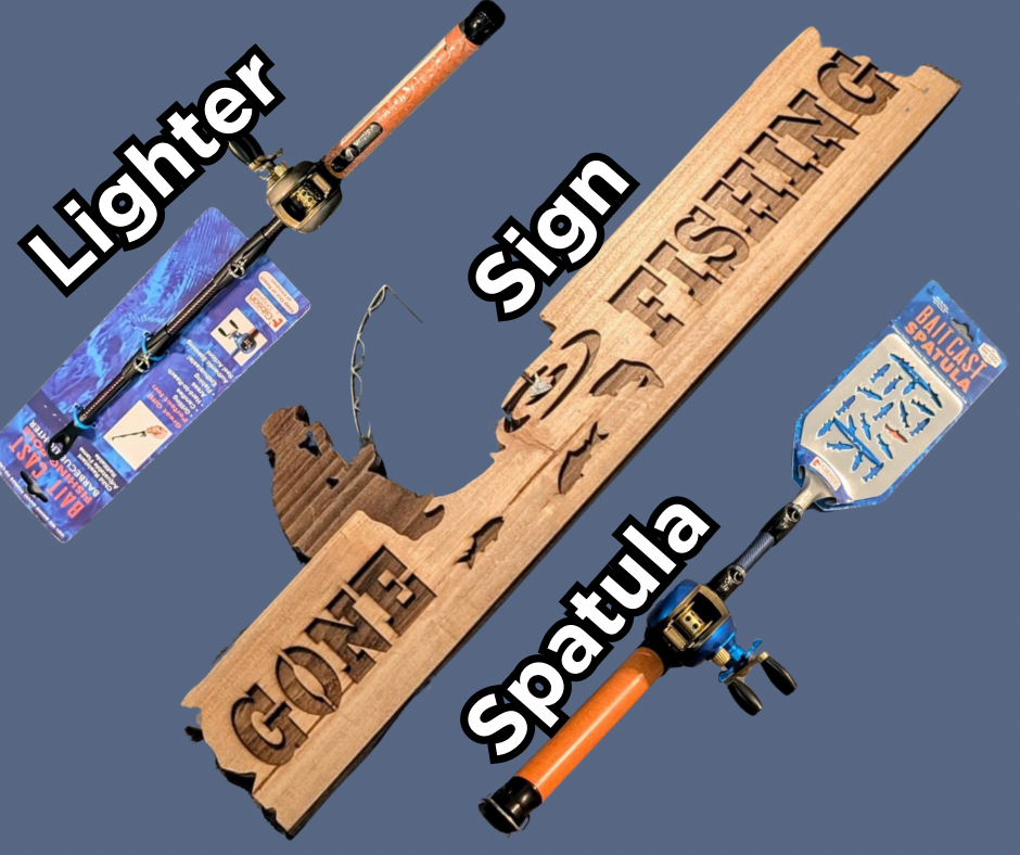 Add a rustic, fishing-inspired element to your home or office with this rod and reel wall sign. A uniquely crafted spatula features a handle designed to resemble a fishing rod and reel, making it an ideal gift for the avid fisherman or outdoor enthusiast. Also, illuminate your space with this one-of-a-kind rod and reel lighter, featuring a custom design that combines the charm of fishing with a hand held lighter for all cooking and camping needs. These three items, perfect for any fishing enthusiast or someone who appreciates outdoor-themed décor, would be a great addition to a collection or a thoughtful gift for someone who loves the art of fishing. They’re sure to attract attention at any auction with their unique and functional designs. Package includes: Gone Fishing Wall Decor Rod and Reel Spatula Rod and Reel Lighter
