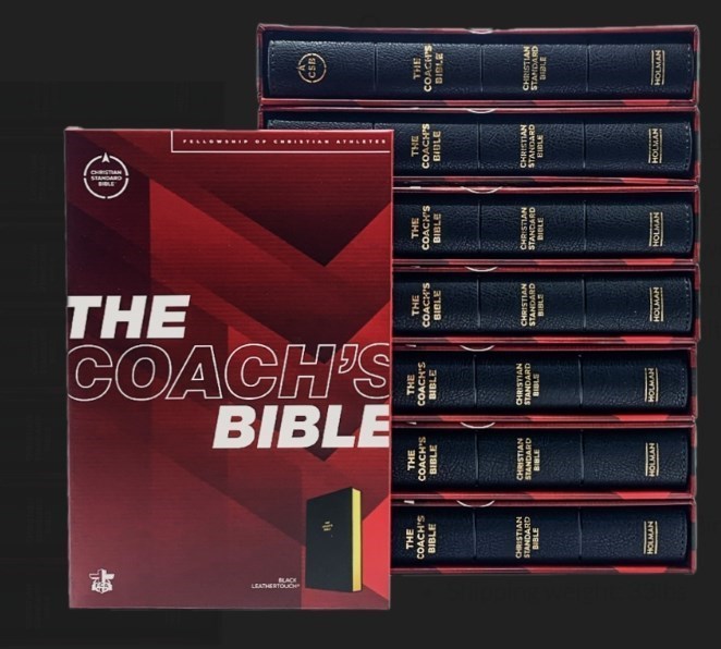 Help us give the gift of God's Word to coaches on our campuses. Each case comes with 16 Bibles Coaches Bible Leather-Touch Edition This leather touch, compact-sized Bible features 365 new and updated devotions written specifically for coaches, as well as Huddle questions, The FOUR and The CORE to equip coaches to spend regular time with God and His Word. QR Codes are featured throughout to connect to more FCA digital resources. Size: 5.37” x 8.25”; CSB