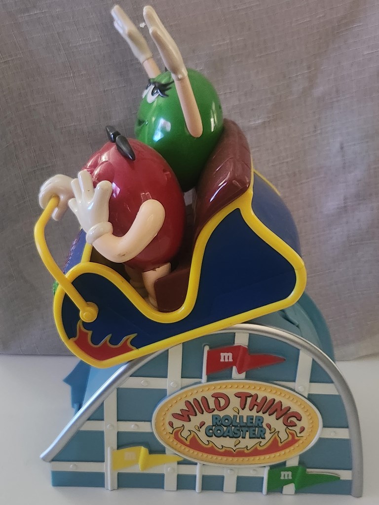 Fun and loveable M&M characters having fun on the Wild Thing Roller Coaster Dispenser.