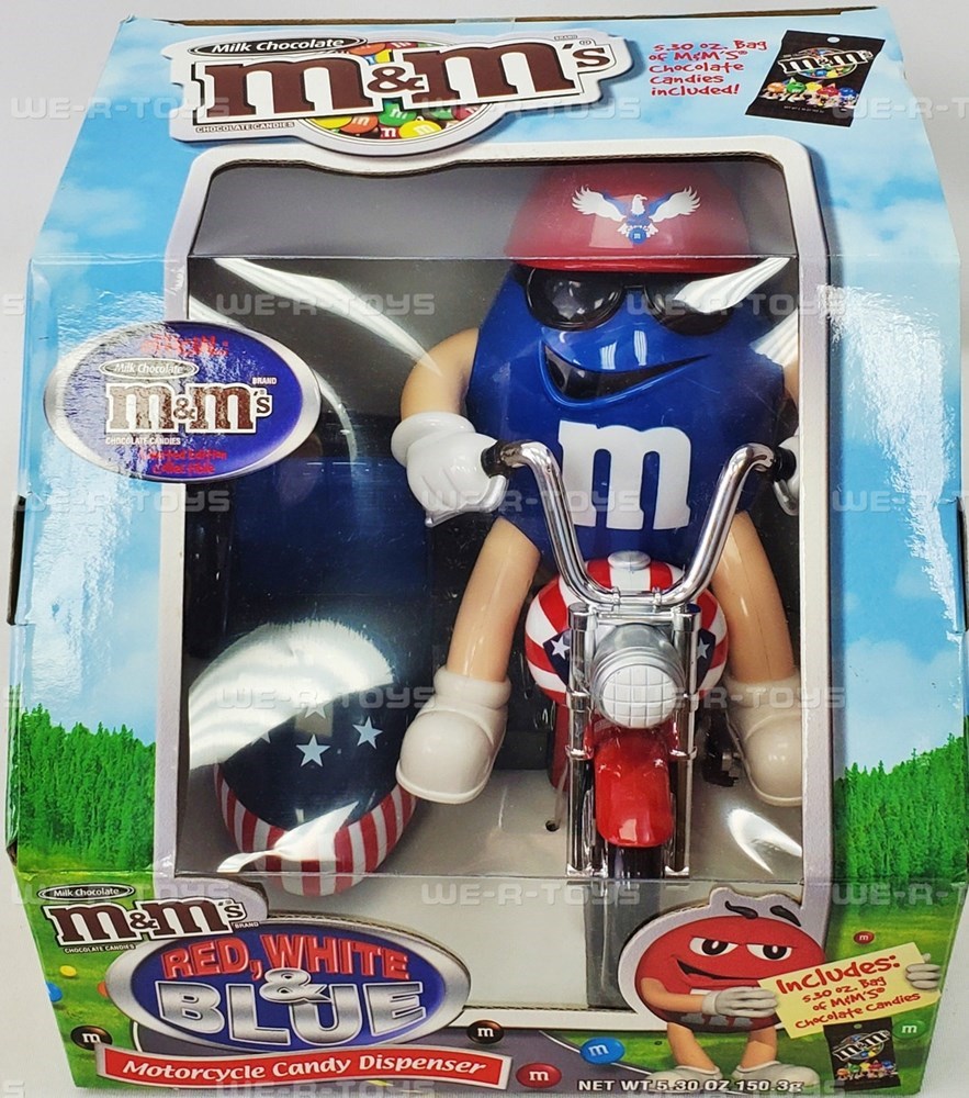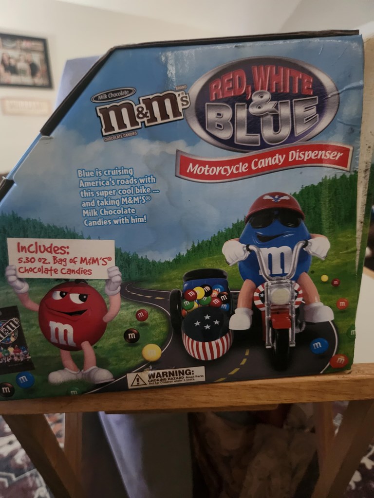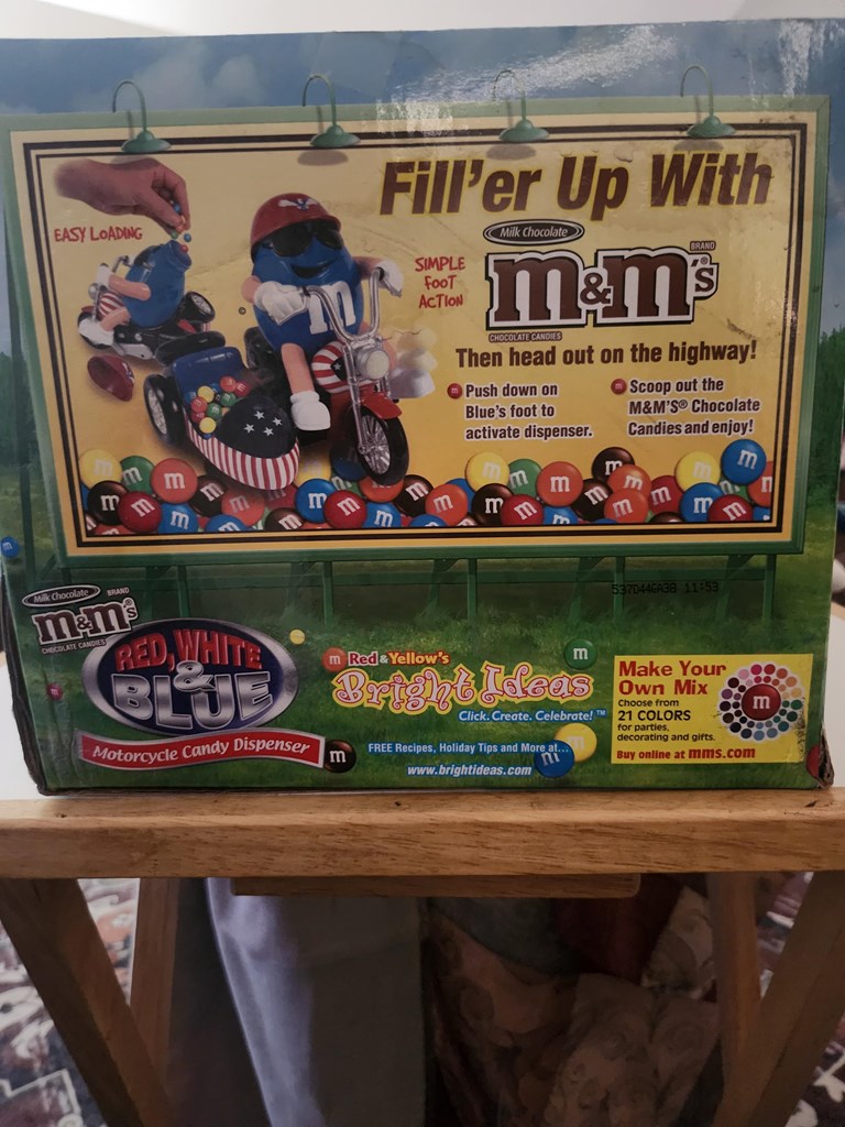 Big Blue riding his hog and dispensing joy as he goes. Take home this s still in the box treasurer. An M&M enthusiasts must have but also fun as a gift.