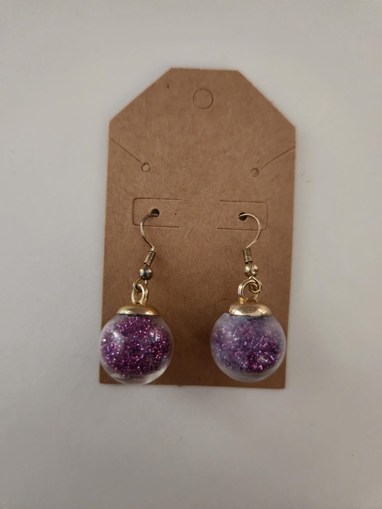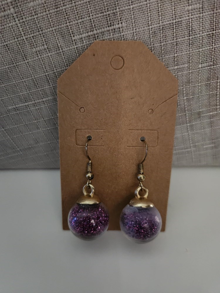 Homemade Globe Earrings with purple glitter shimmering through as you wear these one of a kind pair of earrings.
