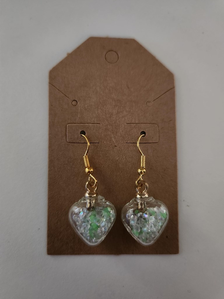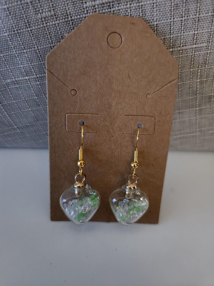 Homemade Heart Earrings filled with clear and green stones great to wear at any time but also ideal for Holiday's such as St. Patrick's Day and Christmas