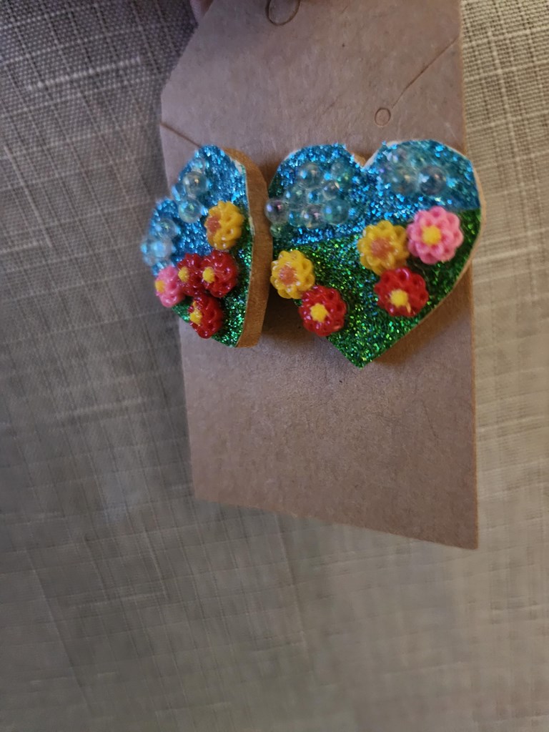Hand Made Unique Earrings that feature a landscape picture with clouds, sky, grass and flowers.