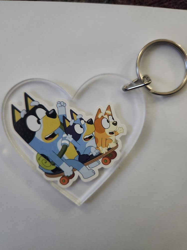 Bluey and the family rides on a skateboard in this Heart shaped keychain good to take with you to remind you of family.