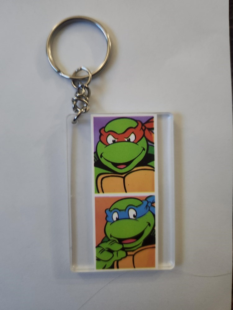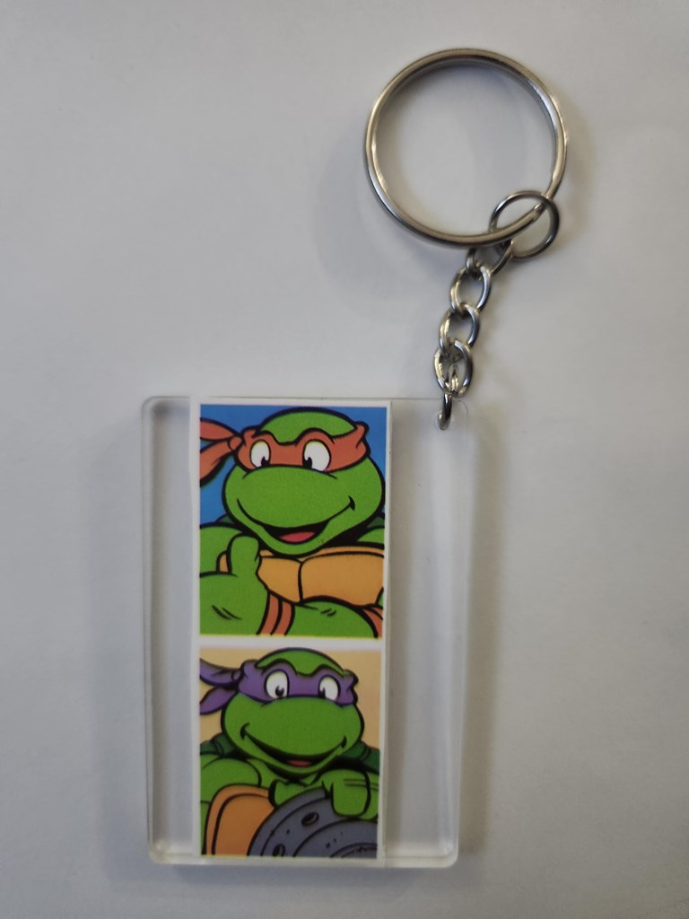 Raphael, Leonardo, Donatello, and Michaelangelo all together on this throwback to the 90's TMNT keychain.