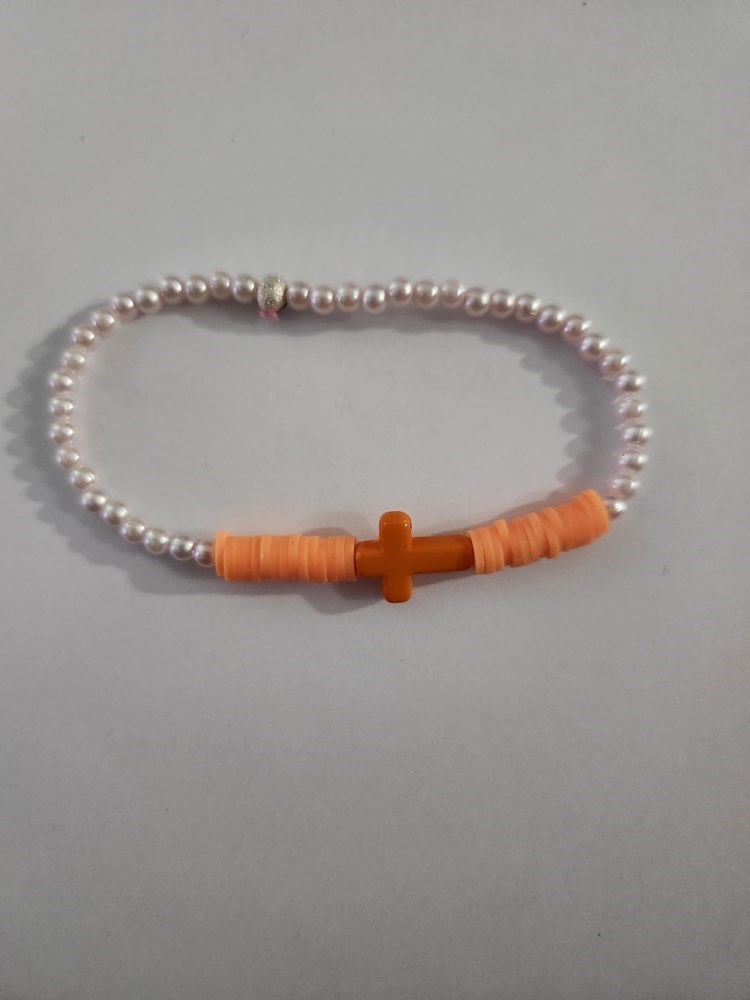 Very pretty pearl beads along with orange cross and beads on the bracelet.